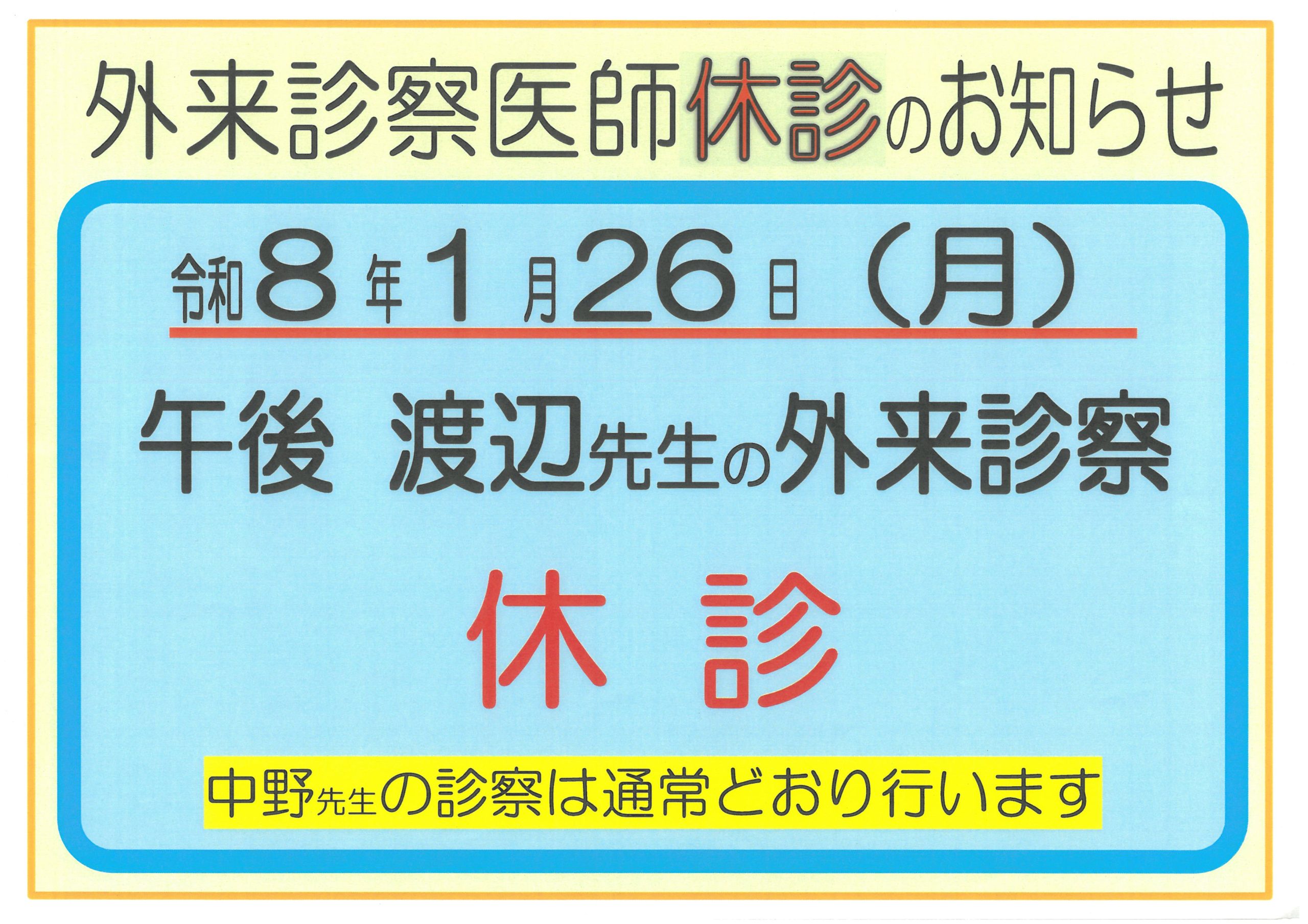 1/26午後からの渡辺先生の外来診察は休診致します